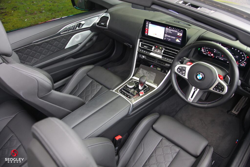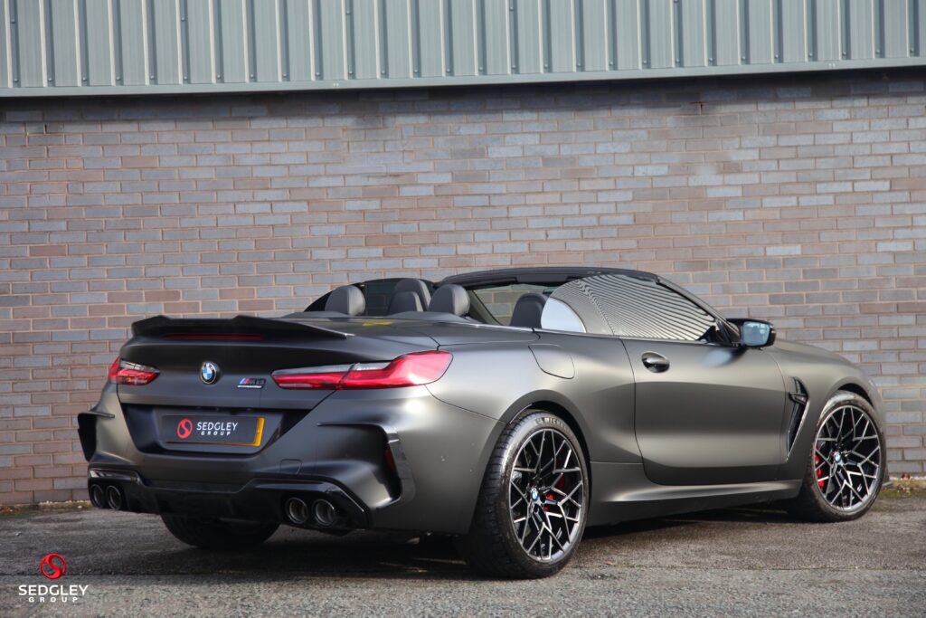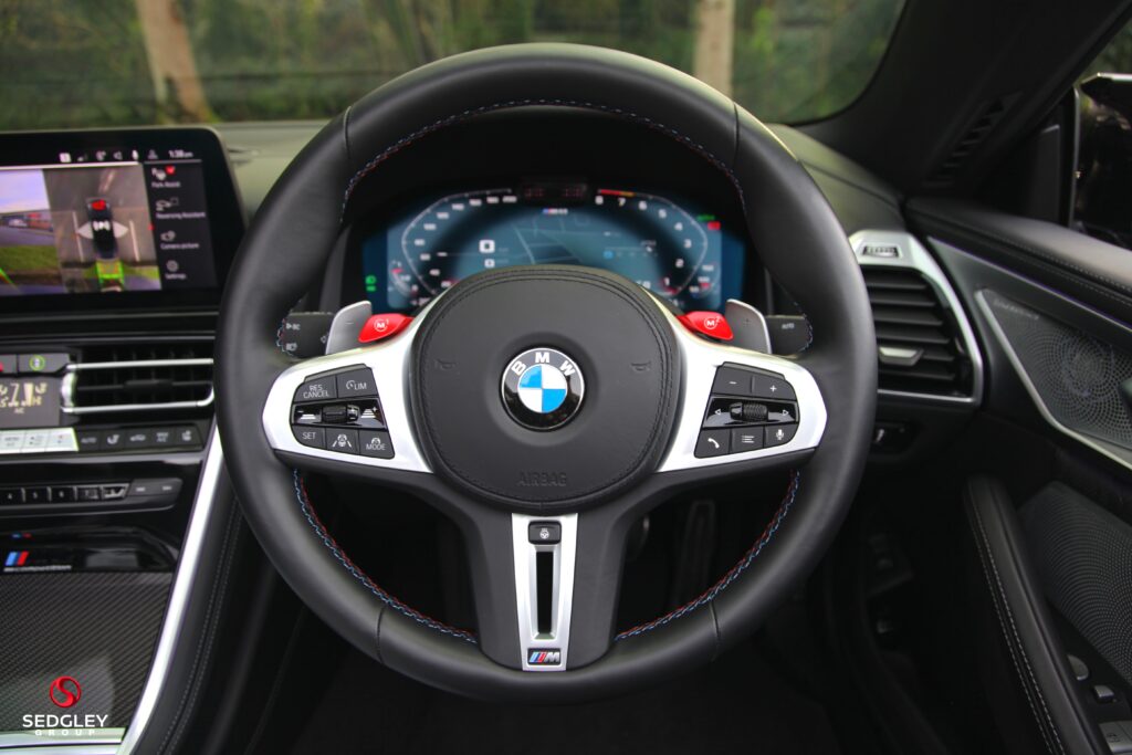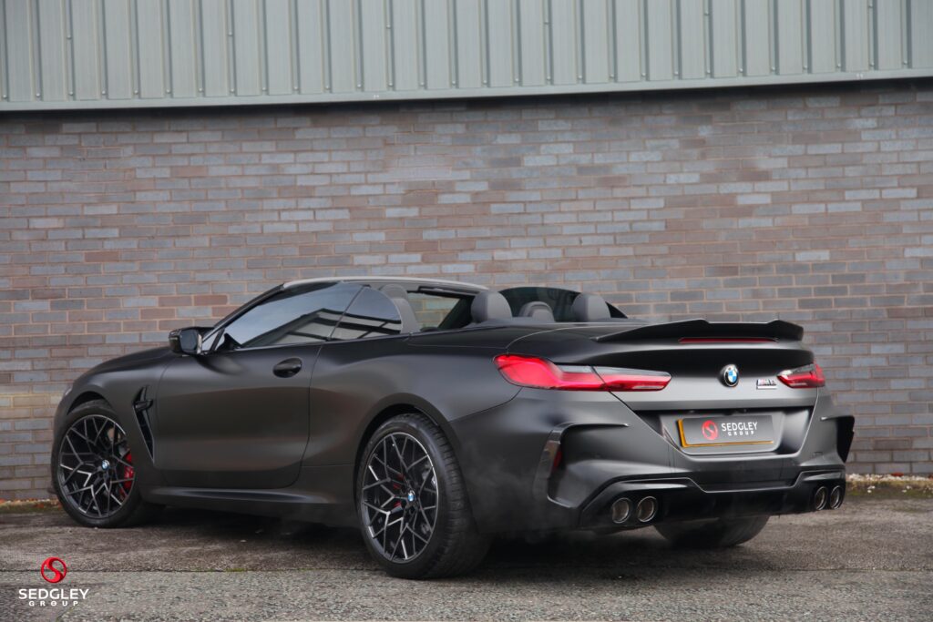 2025 BMW M8 COMPETITION CONVERTIBLE WRAPPED IN SATIN BLACK, VAT QUALIFYING, SCORPION TRACKER AND GHOST SYSTEM FITTED, CARBON EXTERIOR PACK WHICH INCLUDES FRONT CARBON SPLITTER, REAR CARBON BOOT SPOILER AND REAR CARBON CANARDS, DIGITAL HEAD UP DISPLAY, BOWERS AND WILKINS PREMIUM SURROUND SOUND SYSTEM, INTERIOR CARBON PACKAGE, SURROUND VIEW CAMERAS WITH PARK ASSIST PLUS, ELECTRIC FRONT HEATED AND COOLED SEATS WITH MEMORY FUNCTION AND ADJUSTABLE LUMBAR SUPPORT, SWITCHABLE M SPORTS EXHAUST, 20″ M LIGHT STAR DIAMOND CUT ALLOYS WITH RED M BRAKE CALLIPERS, TECHNOLOGY PLUS PACKAGE, HEATED STEERING WHEEL, FRONT HEATED NECK WARMERS, SOFT CLOSE DOORS, COMFORT PLUS PACKAGE, WINTER PACKAGE, ADAPTIVE M SUSPENSION, CRUISE CONTROL WITH BRAKE FUNCTION, ADAPTIVE LED HEADLIGHTS, DRIVING ASSISTANT PRO, COMFORT ACCESS SYSTEM, FULL MERINO BLACK LEATHER INTERIOR, INTERIOR LED LIGHTING PACKAGE, BMW LIVE COCKPIT PRO, HEATED FOLDING ELECTRIC DOOR MIRRORS, HIGH BEAM ASSIST, KEYLESS START, TELEPHONE WITH WIRELESS CHARGING, CLIMATE COMFORT WINDSCREEN, ACTIVE PEDESTRIAN PROTECTION, CARBON CORE, FRONT DOOR ENTRY LIGHTS, FOLLOW ME HOME HEADLIGHT FUNCTION, ELECTRIC ADJUSTABLE STEERING COLUMN, ANTI LOCK BRAKING SYSTEM, OIL LEVEL SENSOR, AUTOMATIC TWO ZONE CLIMATE CONTROL, RAIN SENSOR, BMW CONNECTED PACKAGE PRO, SIDE IMPACT PROTECTION, BMW CONNECTED DRIVE SERVICES, BRAKE PAD WEAR INDICATOR, CRASH SENSOR, WIFI HOTSPOT, WE ARE AN AWARD WINNING DEALERSHIP, ALL VEHICLES ARE HPI CLEAR, £199 ADMIN FEE APPLIES, FOLLOW US ON INSTAGRAM @SEDGLEYGROUP, PLEASE CALL US ON 0161 750 6070 OR 07555 658 658.